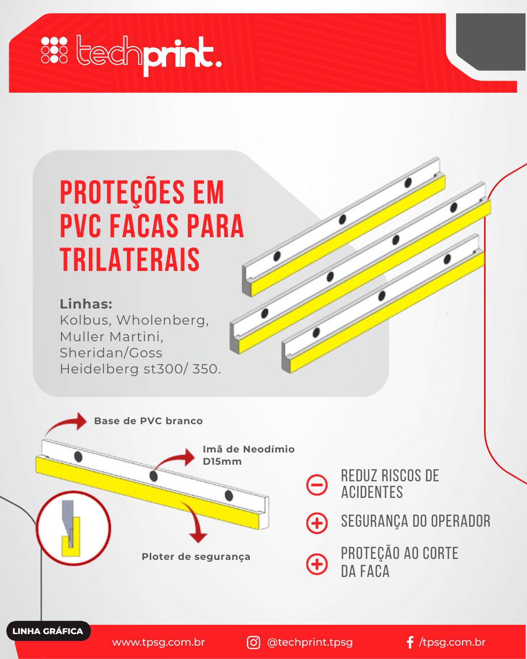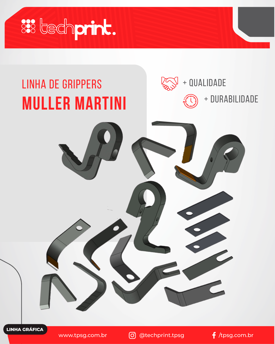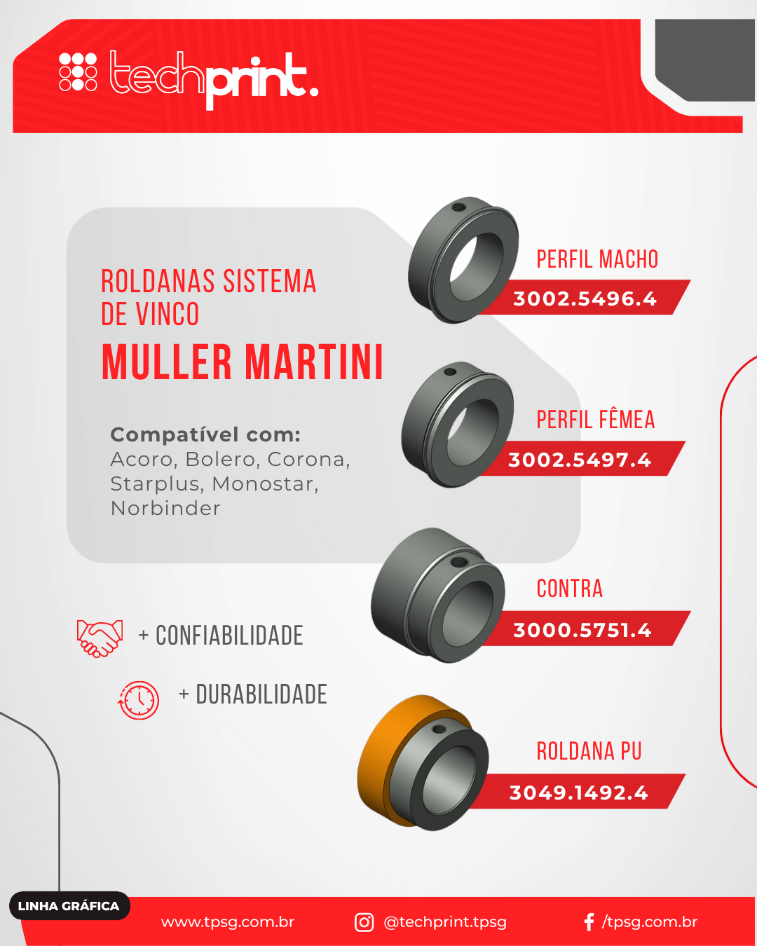 Disponibiliza catálogos com imagens, descrições e part number das peças para todos os seus clientes facilitando a identificação, após a parceria com a Techprint passei a ter tranquilidade e despreocupação na aquisição de peças para nosso parque gráfico.