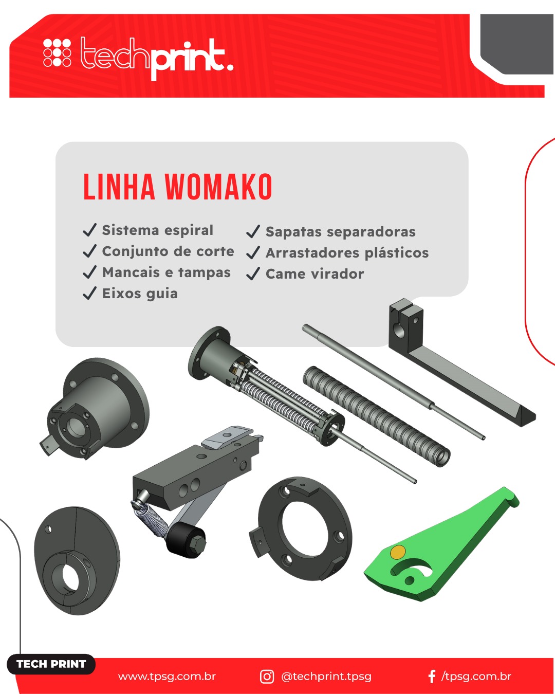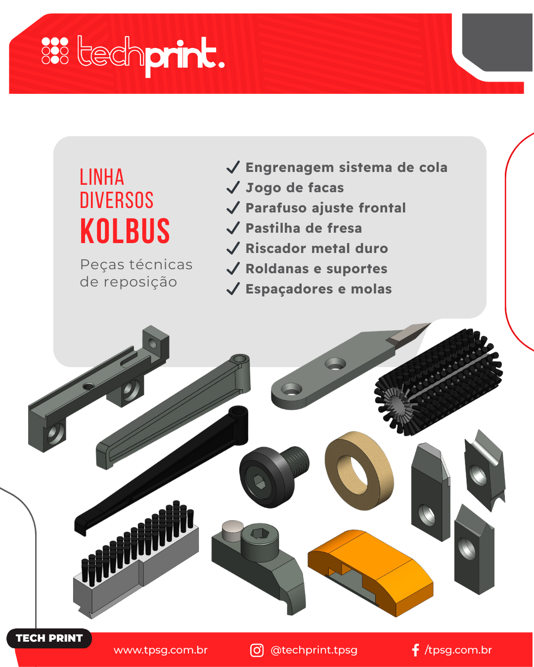 Disponibiliza catálogos com imagens, descrições e part number das peças para todos os seus clientes facilitando a identificação, após a parceria com a Techprint passei a ter tranquilidade e despreocupação na aquisição de peças para nosso parque gráfico.